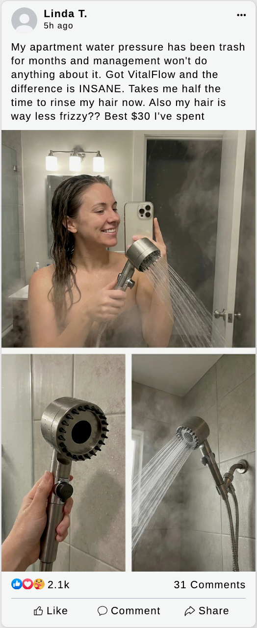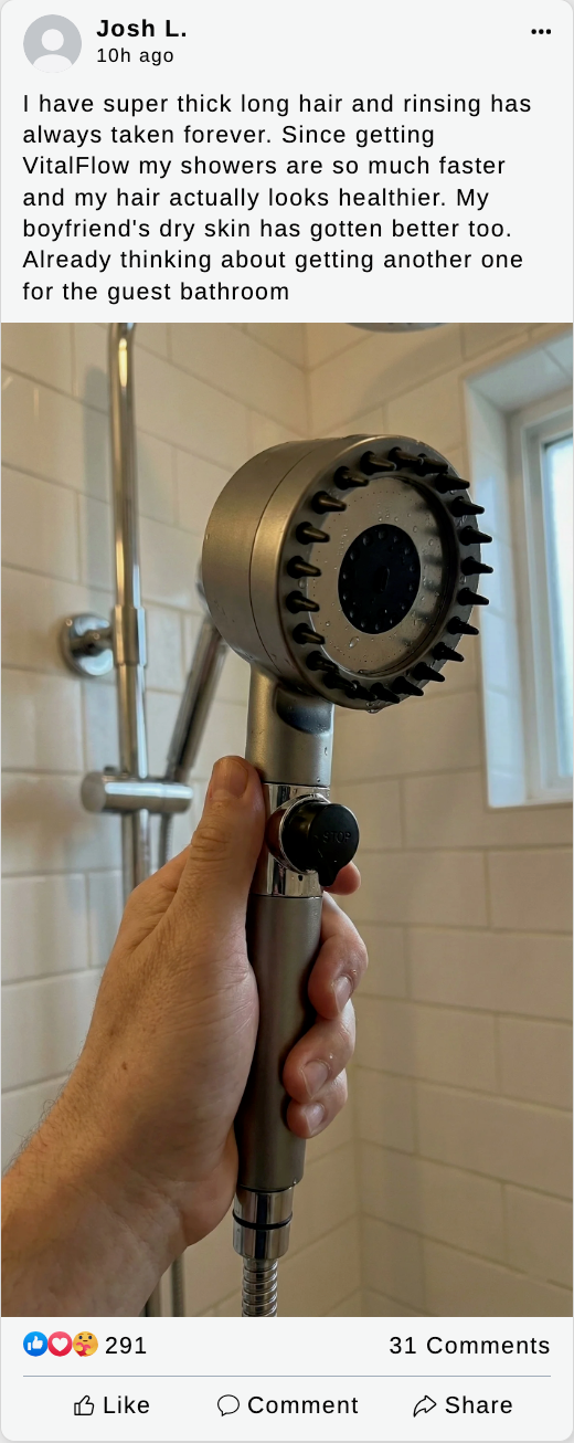 Bought XevraFlow on sale and wasn't expecting much. The water pressure is insanely better than my old shower head and my skin feels way less dry. Noticed my hair getting softer after about 2 weeks. Installation took 3 minutes, no tools needed. Honestly wish I'd gotten this sooner. Best $30 I've spent. ★★★★★ — Sarah M.