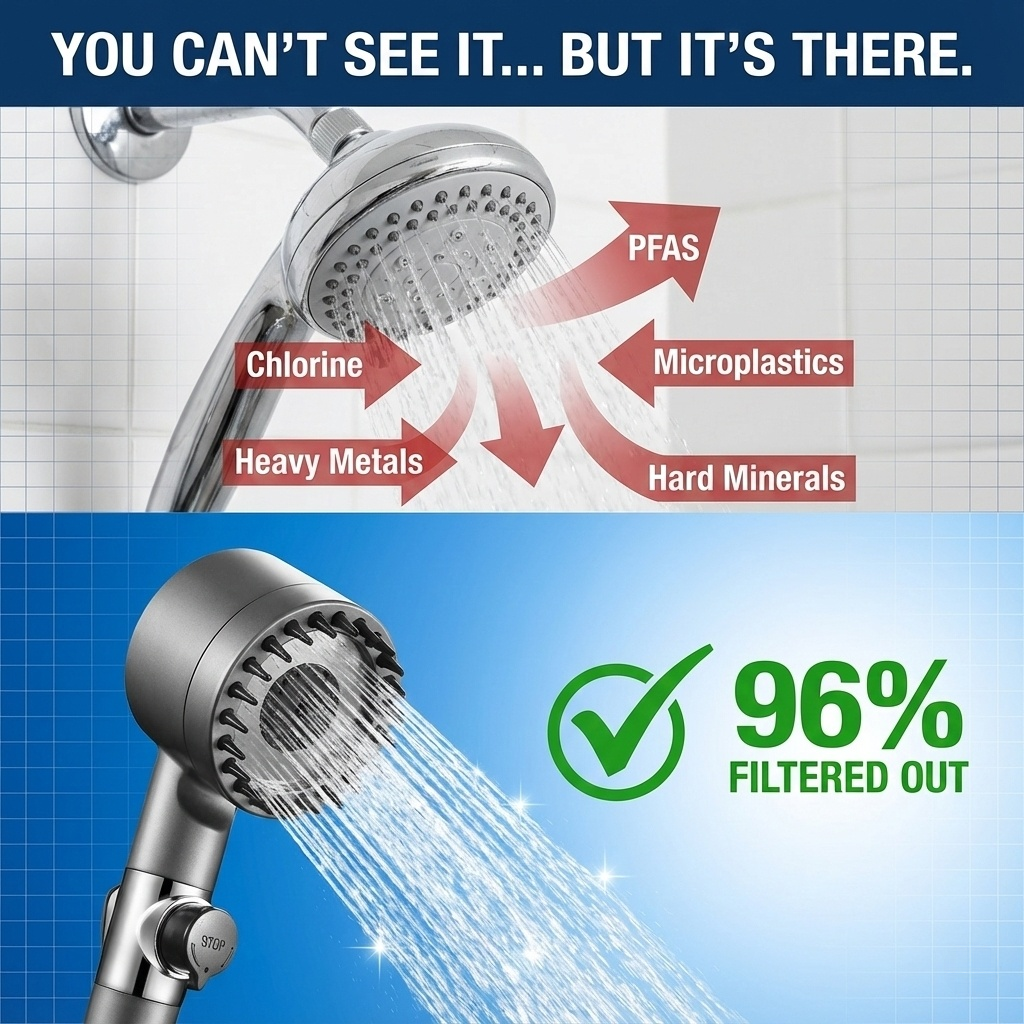Your tap water isn't as clean as you think. Chlorine, heavy metals, microplastics, PFAS chemicals, and hard water minerals flow through your shower every single day—covering your body in contaminants. XevraFlow's Tri-Action Ionic Filtration uses reverse osmosis, physical adsorption, and gravity filtration to remove 96% of these impurities before they touch you. Experience what showering in truly clean water feels like.